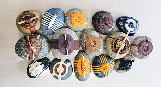 Diane’s Zen Stones are first sealed, and then embellished with intricately woven materials such as bamboo, cane and leather. Please see a variety of stones in the gallery. Each stone is unique and priced from $59 on up depending on the size and weaving intricacy.