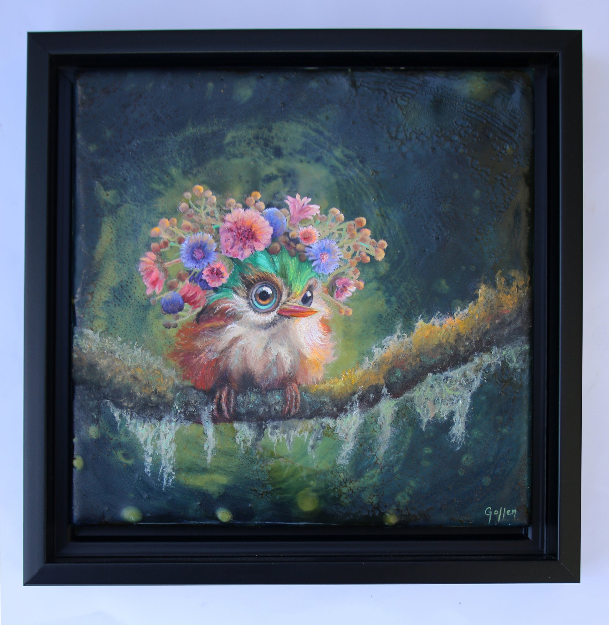 CARRIE GOLLER - Cupcake, Floriferous Cuban Tody Bird, Mixed Media - Oil/Encaustic 8x8 (framed)