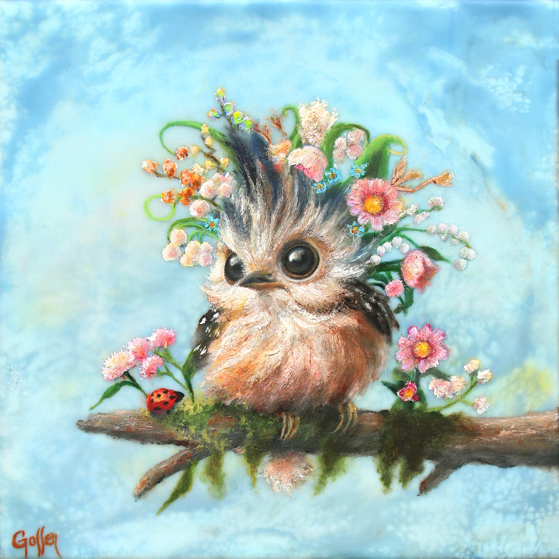 CARRIE GOLLER - Enid (Florifeorus Wowl), Mixed Media - oil/encaustic 8"x8" ***At Rehs Contemporary Galleries, NYC, please inquire at (212) 355-5710*** FOR EXHIBITION AT PHILADELPHIA SHOW