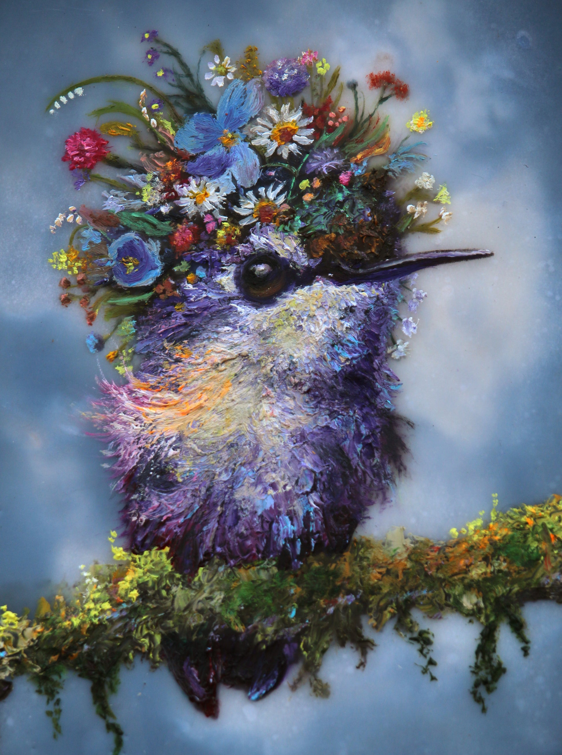 Finola, Floriferous Hummingbird Portrait, 7x5 Mixed Media - oil/encaustic $1300