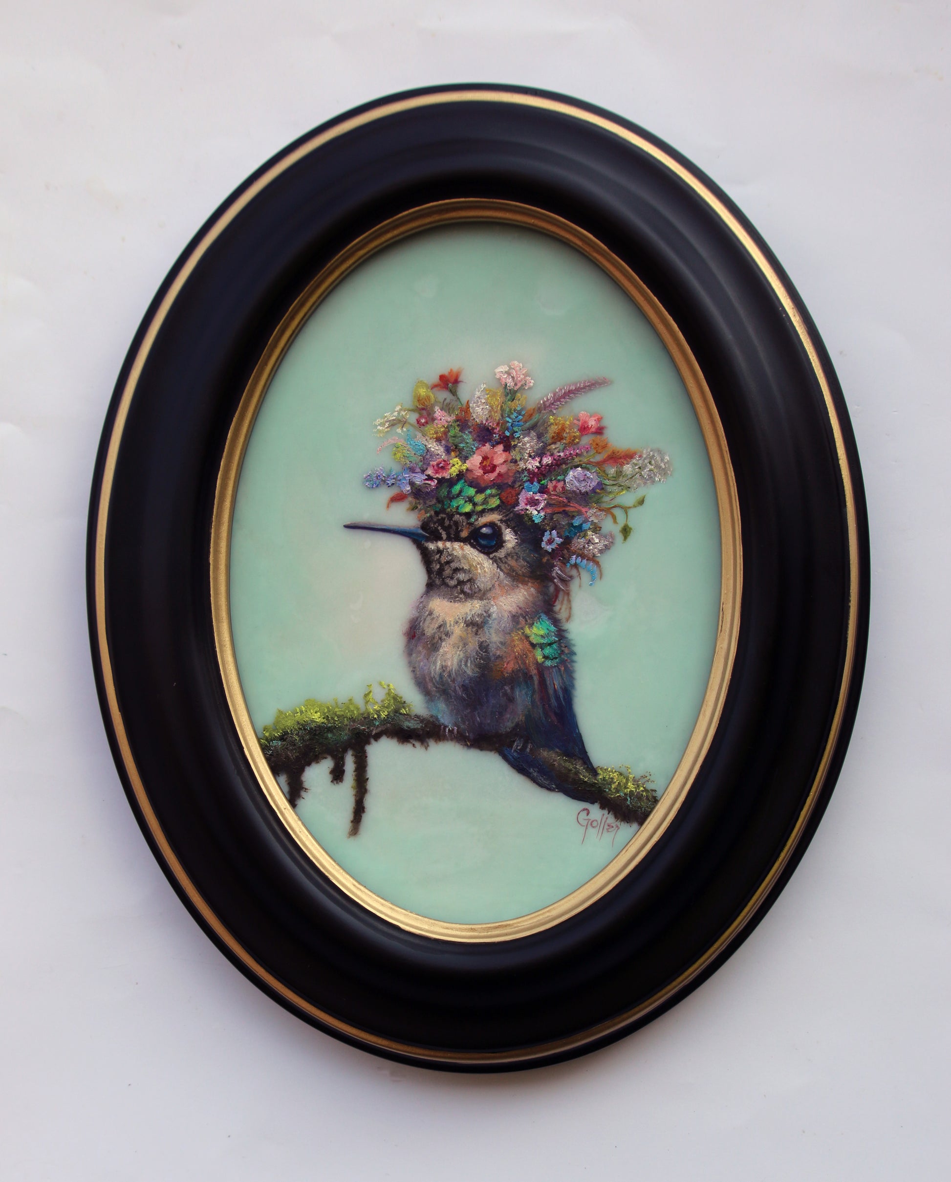 Original miniature mixed media painting on wood panel, framed in a custom oval black wood frame with gold trim.