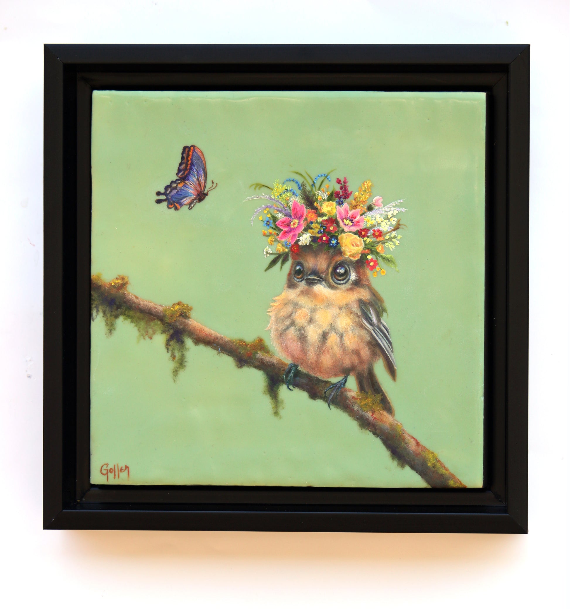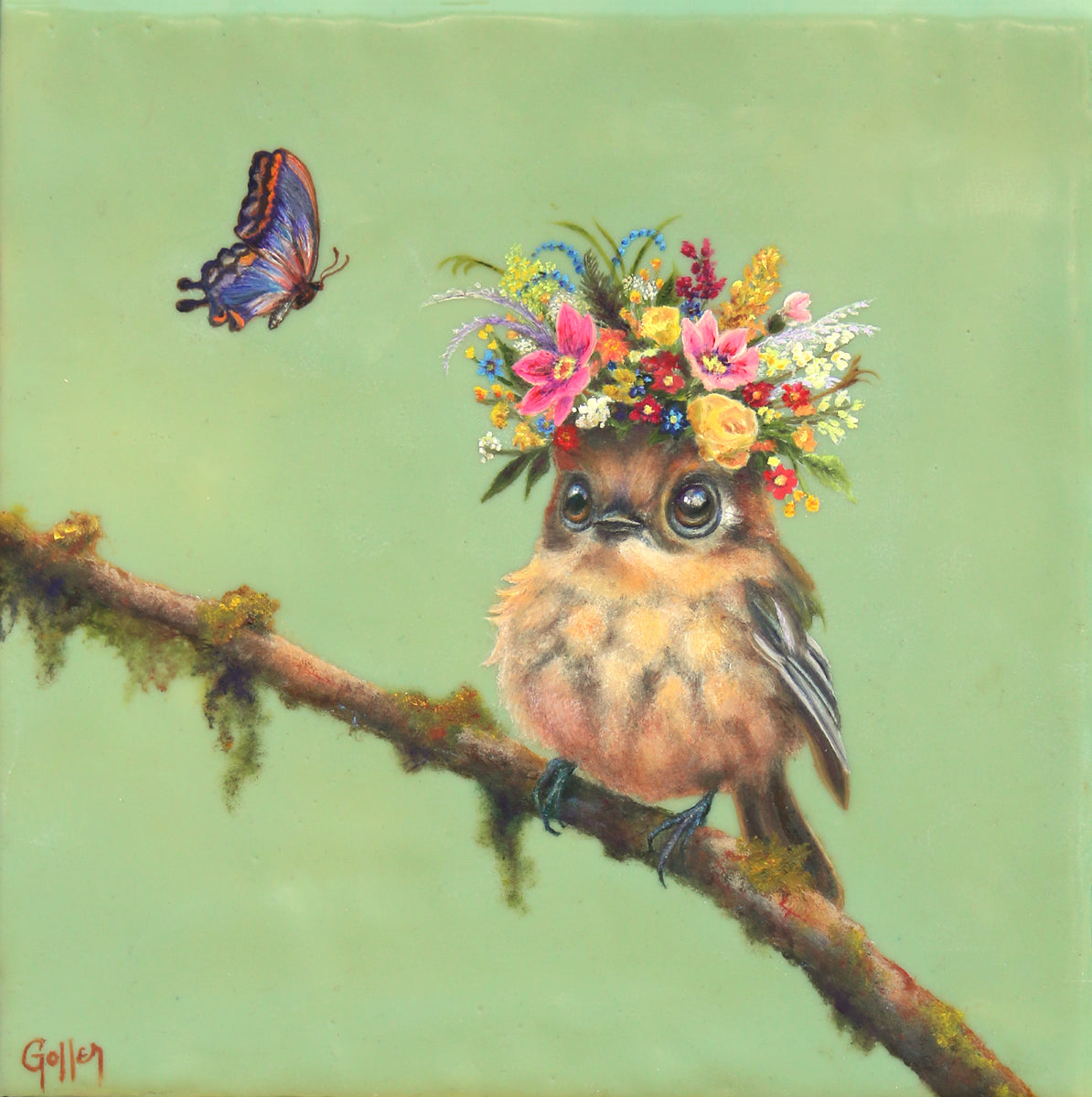 CARRIE GOLLER - Bridget, Floriferous Collection, Mixed media oil/encaustic 8x8 (Bird)***At Jones & Terwilliger Galleries, Carmel, CA please inquire at (831) 626-9100***