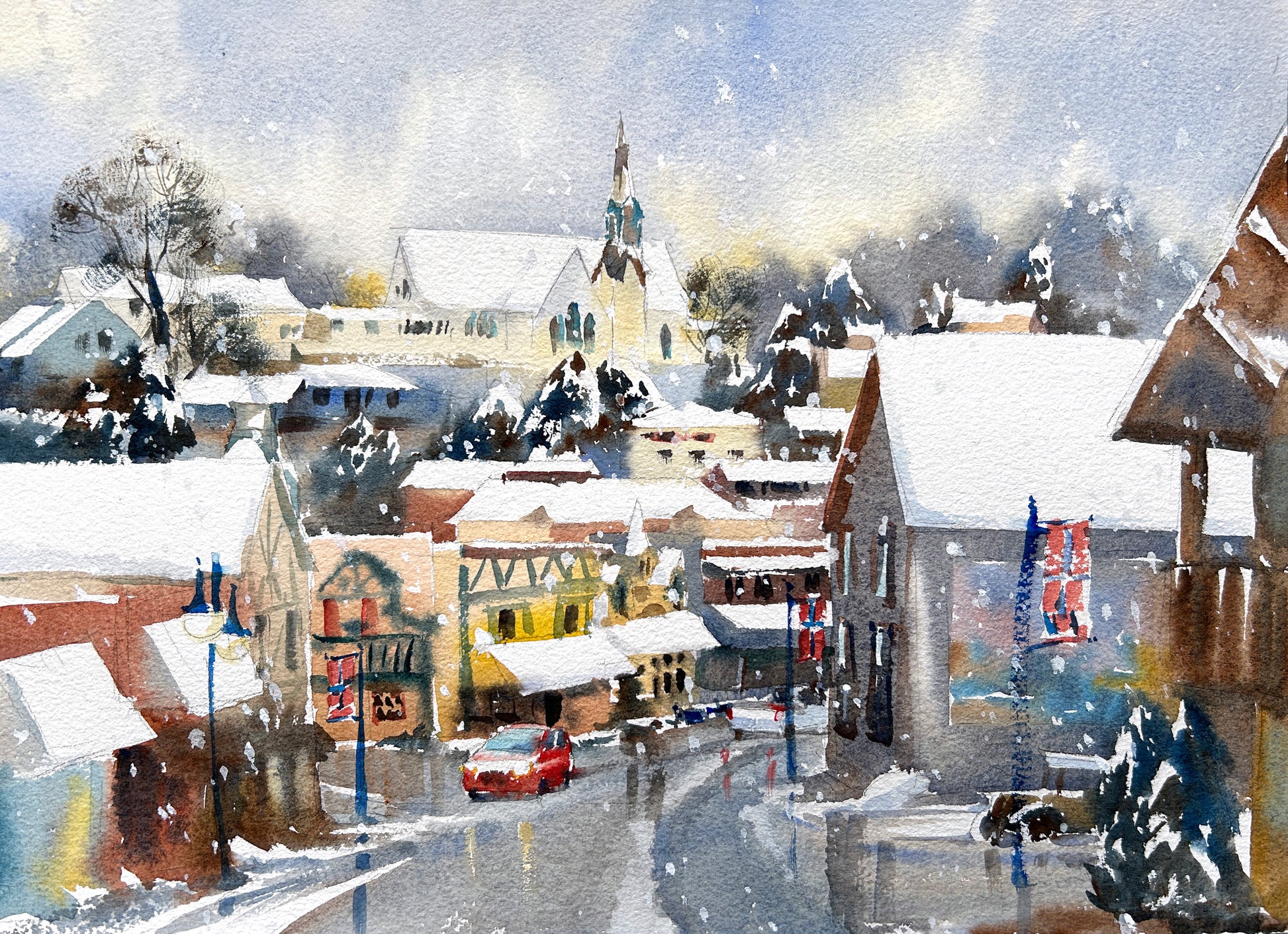 Ina's watercolor painting "Shops on Front St No.6" captures a peaceful yet fleeting moment of beauty in Poulsbo – the town blanked in a fresh coat of snow overnight, quickly dissipating in the Pacific Northwest rain.